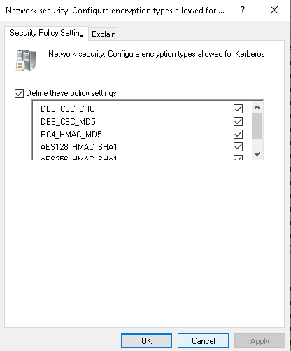 Шаг 4. Настроить допустимые encryption types: Group Policy Management → Default Domain Policy → Computer Configuration → Windows Settings → Security Settings → Local Policies → Security Options → Network security: Configure encryption types allowed for Kerberos